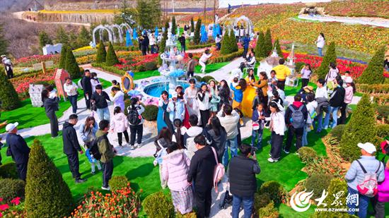 来自外地的研学团队在红叶柿岩云崖花园花海中穿行打卡。图源:大众网