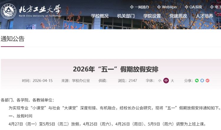 在这场高校春假的浪潮中,最引人注目的莫过于湘潭理工学院。作为湖南首个官宣放春假的高校,该校明确将于4月30日至5月6日放假,连休7天。在北京,这股“春风”同样盛行。北京联合大学的春假安排在4月7日至12日,鼓励师生走出校园开展实践调研;北京信息科技大学则设定了为期一周的“春假研学”时间;北方工业大学更是将春假与五一拼接,形成了长达9天的假期。