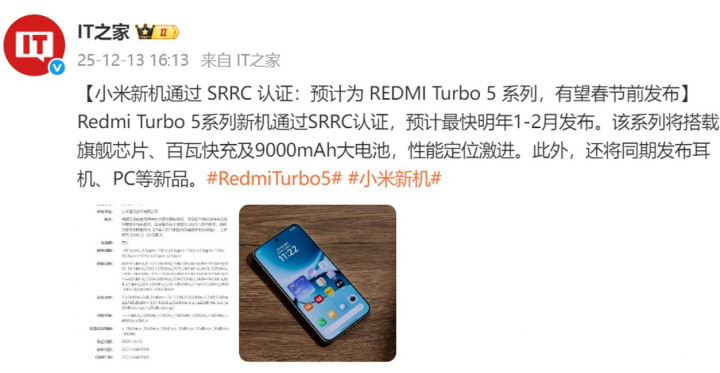 谁还等K90降价?小米春节前放大招,全家桶新品集体官宣!除了本月预热的小米17 Ultra股票配资电话,真正的压轴王红米Turbo5系列已正式入网,Pro版塞下9000mAh电池+天玑9500e芯片,标准版8000mAh续航封神,16GB+1TB拉满配置,2000档焊门侠稳了!